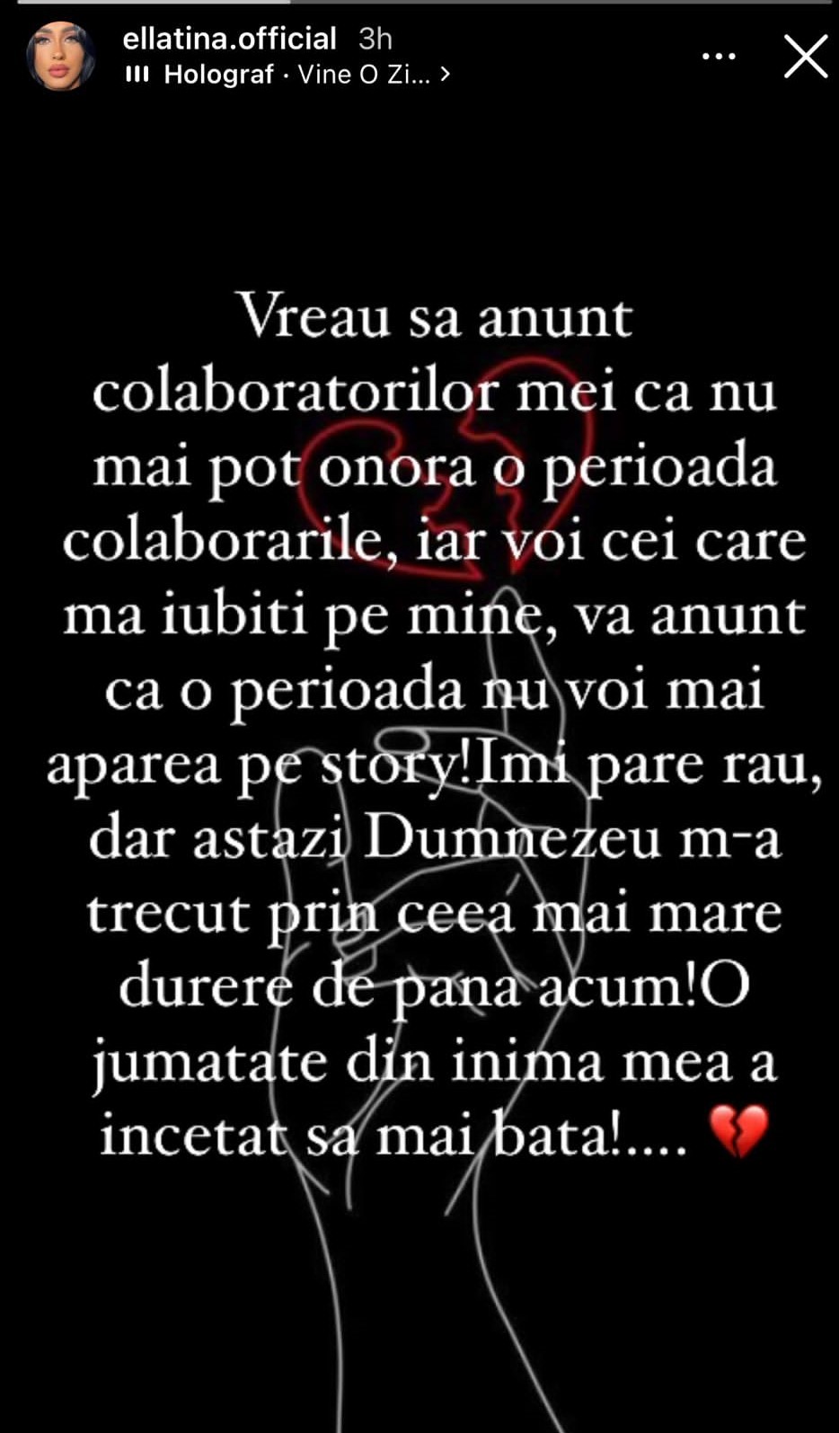 Ella trece prin momente dureroase. Fosta concurentă de la "Puterea Dragostei" a transmis un mesaj în care anunță că va lipsi o perioadă din mediul online. Deși nu a oferit mai multe detalii, bruneta a ținut să sublinieze că "trăiește cea mai mare durere de până acum": "Vreau să anunț colaboratorilor mei că nu mai pot onora o perioadă colaborările, iar voi cei care mă iubiți pe mine, vă anunț că o perioadă nu voi mai apărea pe story! Îmi pare rău, dar astăzi Dumnezeu m-a trecut prin cea mai mare durere de până acum!