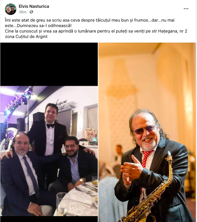 „Îmi este atat de greu sa scriu asa ceva despre tăicuțul meu bun și frumos…dar…nu mai este…Dumnezeu sa-l odihnească! Cine l-a cunoscut și vrea sa aprindă o lumânare pentru el puteți sa veniți pe str. Hațegana, nr 2 zona Cuțitul de Argint” este mesajul pe care Elvis Năsturică l-a transmis sâmbătă, 18 septembrie, pe pagina lui de pe o rețea de socializare.