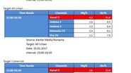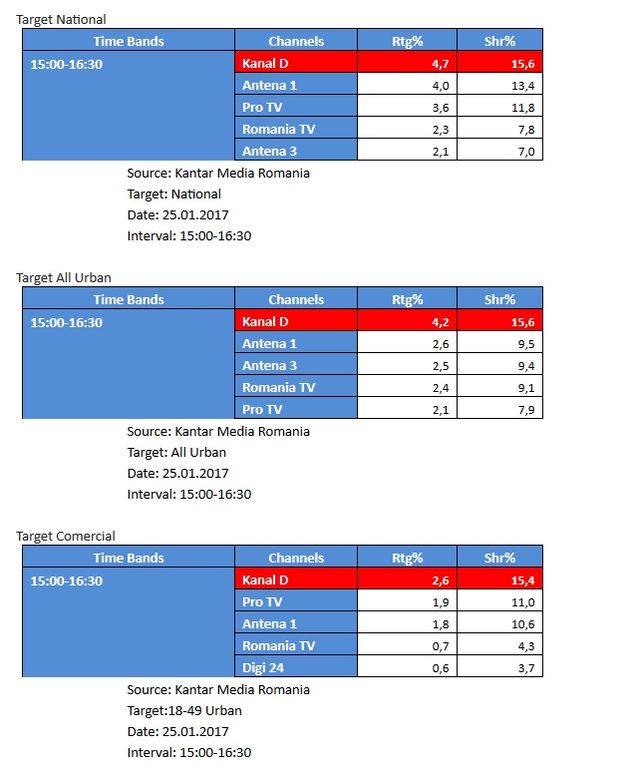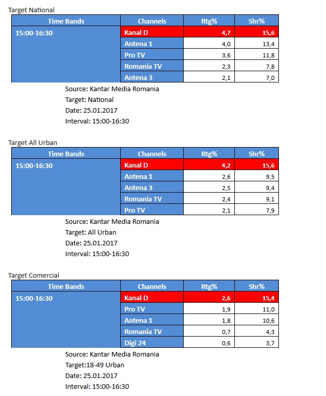 Ieri, in intervalul 15:00 – 16:30, Kanal D a inregistrat 4,7% rating si 15,6% cota de piata, pe targetul National, 4,2% rating si 15,6% cota de piata, pe targetul All Urban, si 2,6% rating si 15,4% cota de piata, in randul publicului din mediul urban cu varste cuprinse intre 18 si 49 de ani.