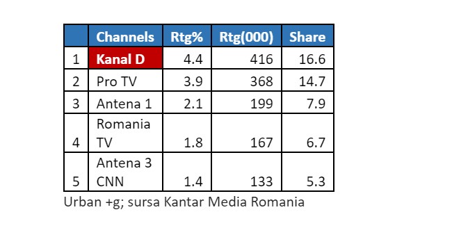 Vineri seara, romanii au ales din nou “Jocul cuvintelor cu Dan Negru”, emisiunea care antreneaza mintea si vocabularul plasand Kanal D pe primul loc la orase, in Prime Time. Conform datelor oferite de Kantar Media Romania, statia a inregistrat 4,4% Rating si 16,6% cota de piata, pe targetul All Urban, in intervalul difuzarii quiz-ului (22:30-24:00). Editia de aseara a fost urmarita de o medie de 695.000 de fani ai emisiunii din intreaga tara, in fiecare minut al difuzarii.