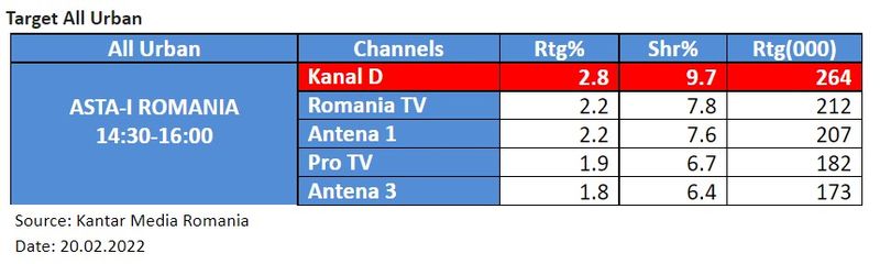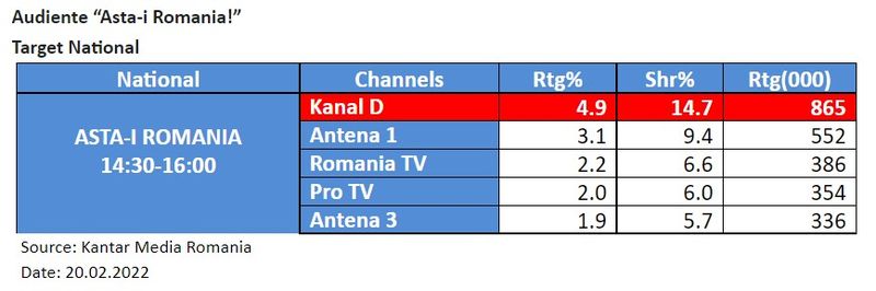Duminica, 20 februarie, emisiunea “Asta-i Romania!” a pozitionat Kanal D pe primul loc in preferintele romanilor, atat la nivelul intregii tari cat si la orase, conform datelor furnizate de Kantar Media Romania.