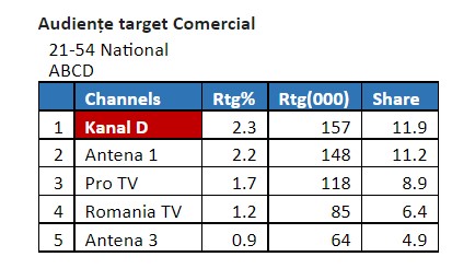 Duminică, 18 septembrie, emisiunea “Asta-i România!” a fost prima opțiune a telespectatorilor români, poziționând postul TV Kanal D pe primul loc în preferințele acestora, la nivelul întregii țări și pe targetul Comercial, conform datelor furnizate de Kantar Media România.