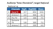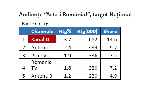 Ieri, în intervalul difuzării emisiunii, 14:30 – 16:00, emisiunea “Asta-i România!” a poziționat stația TV Kanal D pe primul loc în topul televiziunilor din România, acumulând un rating de 3,7% și o cotă de piață de 14,6% pe targetul Național, și 2,3% puncte de rating și 11,9% cotă de piață, pe targetul Comercial.