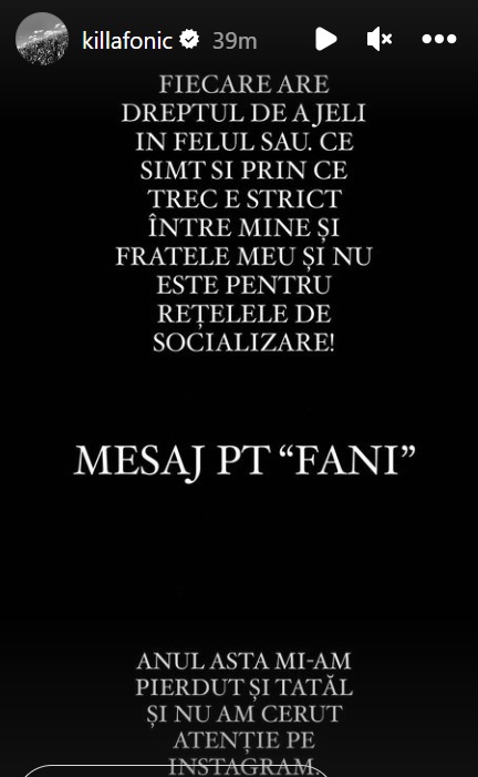 „Fiecare are dreptul de a jeli în felul său. Ce simt și prin ce trec e strict între mine și fratele meu și nu este pentru rețelele de socializare! Anul ăsta mi-am pierdut tatăl și nu am cerut atenție pe Instagram”, a scris Killa Fonic pe platforma de socializare.