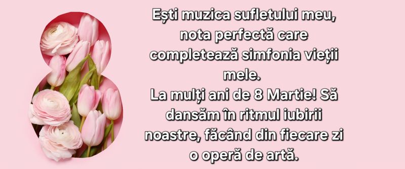 - „Ești muzica sufletului meu, nota perfectă care completează simfonia vieții mele. La mulți ani de 8 Martie! Să dansăm în ritmul iubirii noastre, făcând din fiecare zi o operă de artă.”