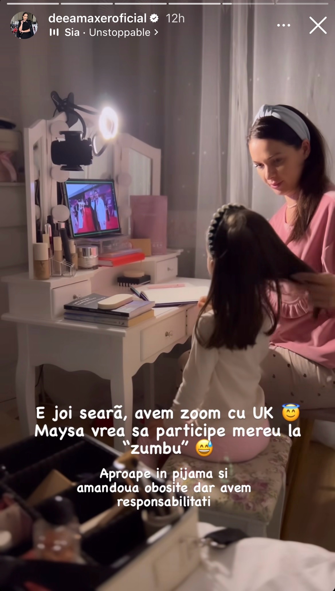 „E joi seară, avem ZOOM cu UK. Maysa vrea să participe mereu la „Zumbu”. Aproape în pijama și amândouă obosite, dar avem responsabilități”, a scris Deea Maxer în dreptul videoclipului în care apare alături de fiica sa.