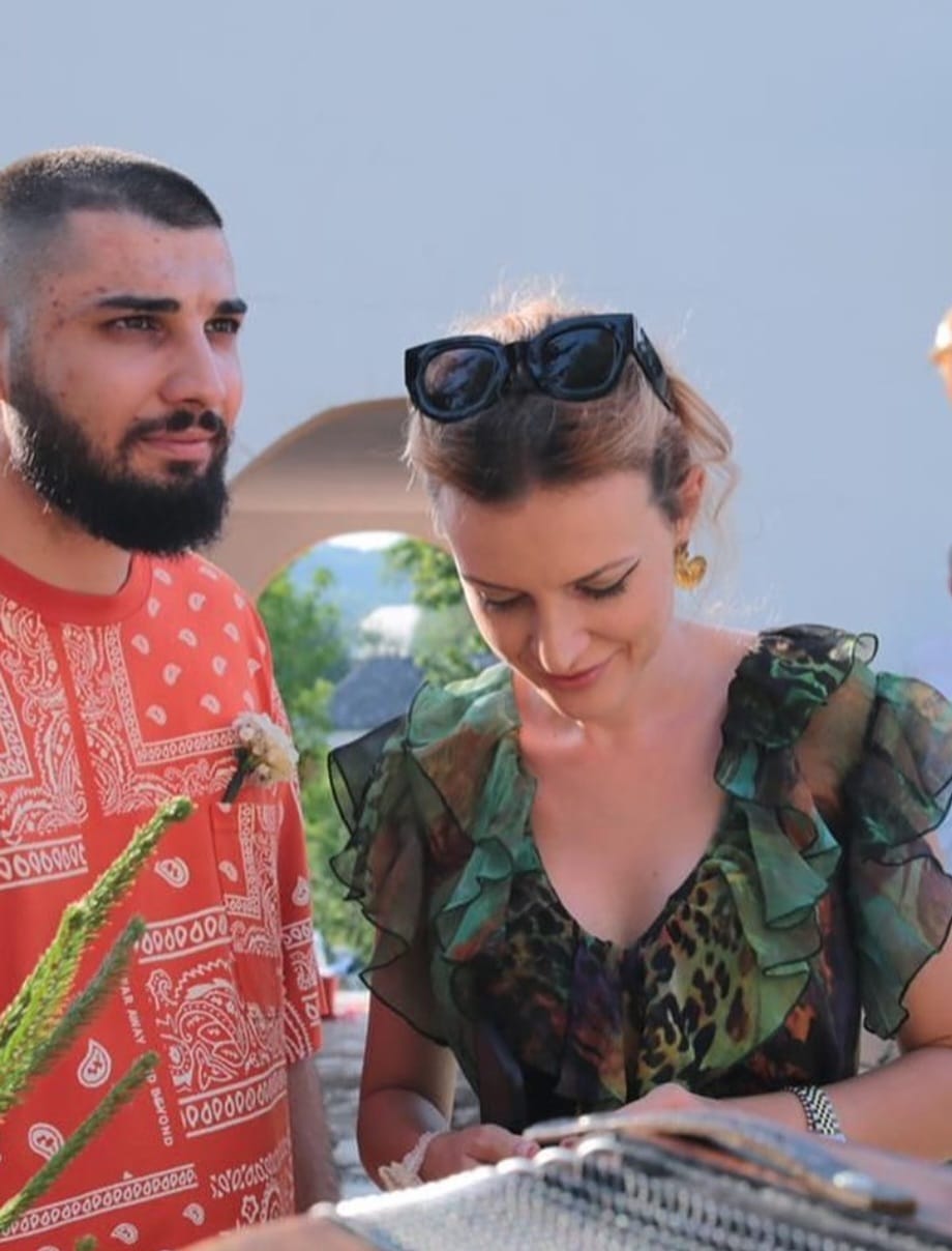 Nu i-au avut alături decât pe prietenii lor, care le vor fi și nași la cununia religioasă: "Ne-am dorit întotdeauna să facem ceva foarte intim. Nunta e altceva, dar cununia civilă a fost una simplă. Nu aveam chef de organizat petrecere, de căutat ornamente, toate lucrurile astea. Rochia de mireasă o să o îmbrac, dar peste ani și ani.. (râde, n. red.) Ne-am dorit să mergem și fără martori la cununie, dar nu se poate. Am fost cu prietenii noștri, Ali Sultanul și cu soția lui, ei vor fi și nașii noștri.