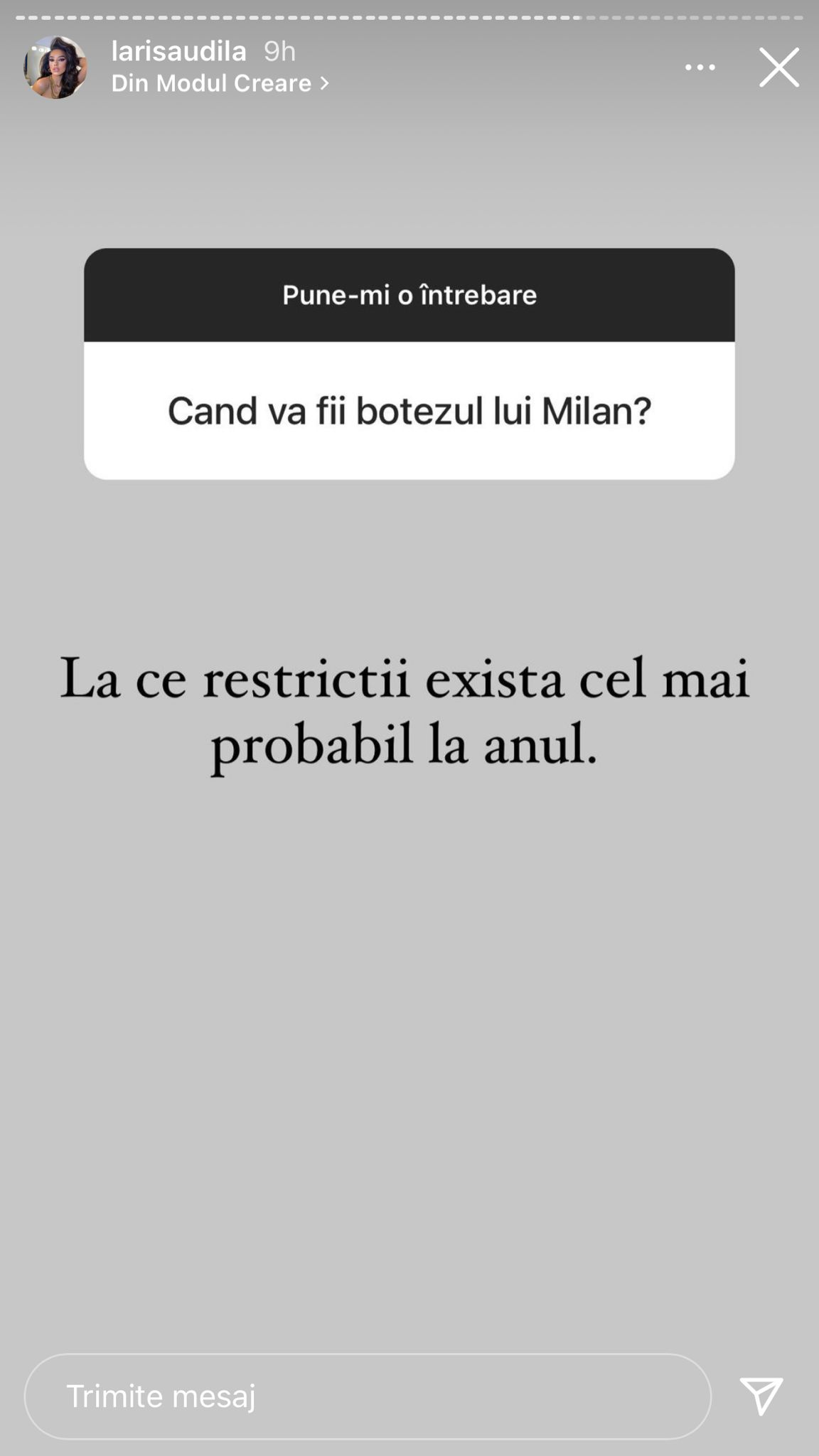 Larisa Udilă este foarte activă pe rețelele sociale, acolo unde ține legătura cu urmăritorii ei din mediul online și le răspunde la multe curiozități. Vedeta a fost întrebată de o persoană și despre botezul micuțului Milan, Larisa oferind un răspuns pe măsură. Fosta concurentă de la ”Bravo, ai stil” a explicat faptul că botezul celui mic va avea loc, cel mai probabil, anul viitor, căci anul acesta sunt foarte multe restricții.