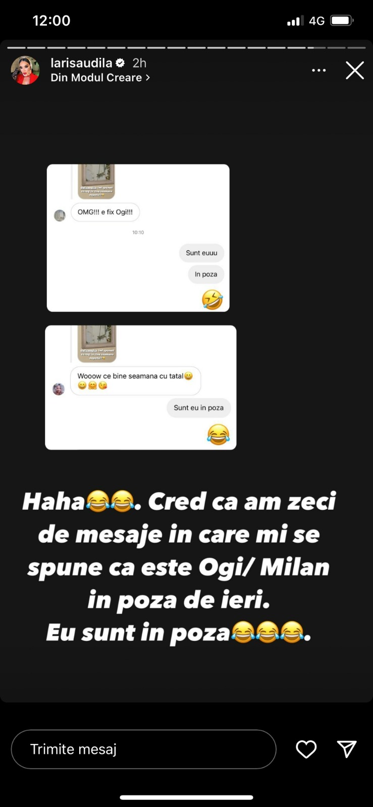 „Haha. Cred că am zeci de mesaje în care mi se spune că este Ogi/ Milan în poza de ieri. Eu sunt în poză”, a scris Larisa Udilă, în dreptul unor conversații cu fanii, care erau de părere că în fotografii este Alexandru Ogică.