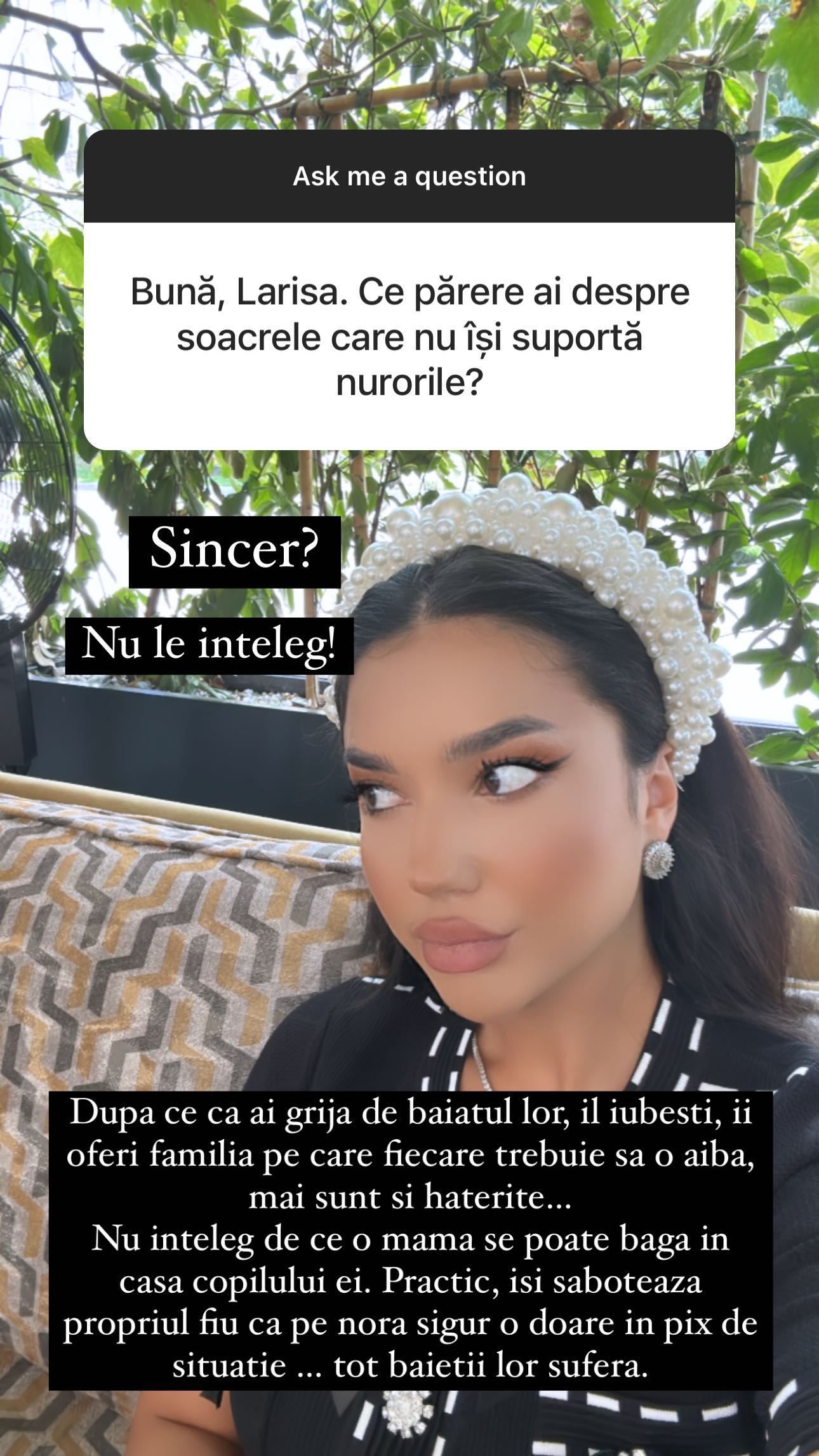„Sincer? Nu le înțeleg! Dupa ce că ai grijă de băiatul lor, îl iubești, îi oferi familia pe care fiecare trebuie să o aibă, mai sunt și haterițe... Nu înțeleg de ce o mamă se poate băga în casa copilului ei. Practic, își sabotează propriul fiu, că pe noră sigur o doare în pix de situație... tot băieții lor suferă”, a scris vedeta pe InstaStory