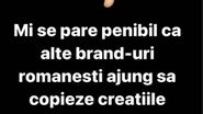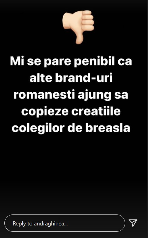 „Mi se pare penibil că alte brand-uri românești ajung să copieze creațiile colegilor de breaslă. Aceasta este o copie ieftină. Nu doresc să defăimez pe nimeni, însă mi se pare trist'', a declarat Andra Ghinea pe rețelele de socializare.