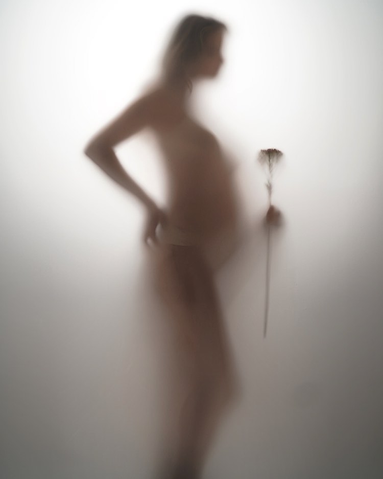 Într-o cabină de duș, după geamul aburit al cabinei, Laura Cosoi a creat una dintre cele mai frumoase fotografii ale sale din timpul sarcinii.