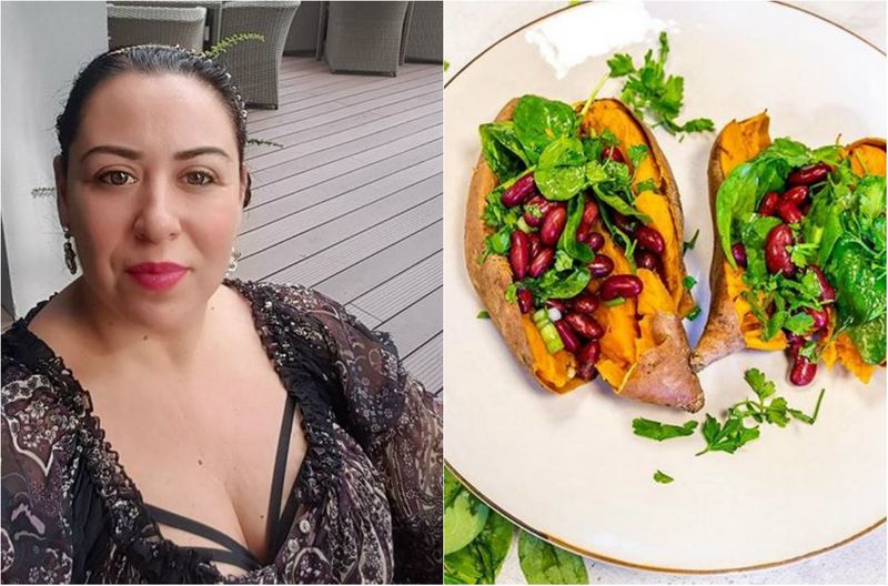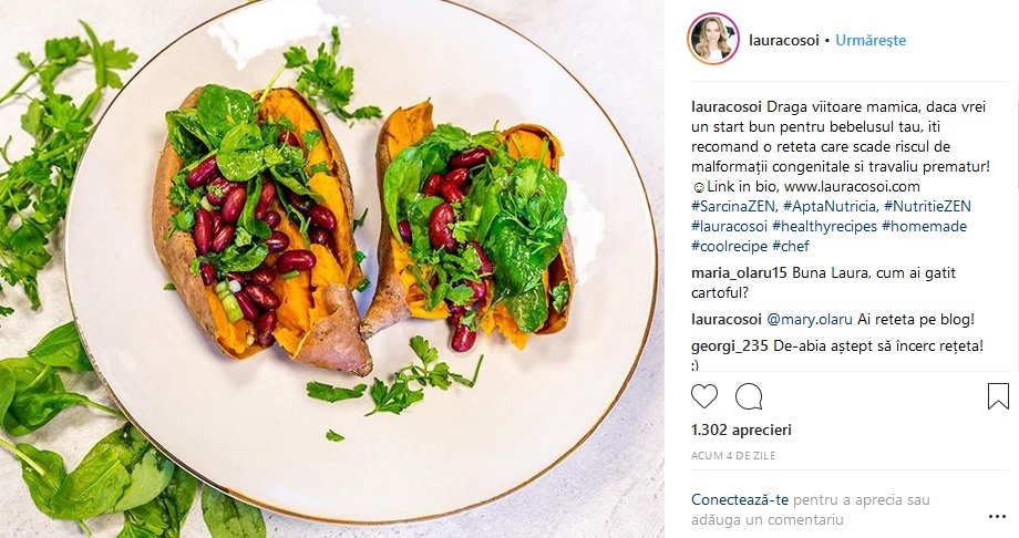 „Am fost întotdeauna conştientă de beneficiile unei alimentaţii sănătoase şi al unui mod de viaţă din care să nu lipsească mişcarea. Însă, odată cu perioada sarcinii, am resimţit mai intens această responsabilitate. Alegerile alimentare influenţează nu numai sănătatea mea, ci şi cea a fetiţei mele. De aceea, am căutat să fiu cât mai bine informată, pentru a-i oferi bebeluşului meu acele alimente care să-i asigure o sănătate „de fier”! Cartofii dulci la cuptor cu fasole neagră sunt un preparat simplu de realizat. Am adăugat în această reţetă şi frunze de baby spanac, un superaliment, ideal pentru femeile însărcinate. Conţine mari cantităţi de acid folic, care scade riscul de malformaţii congenitale şi travaliu premature”, a scris Laura Cosoi.