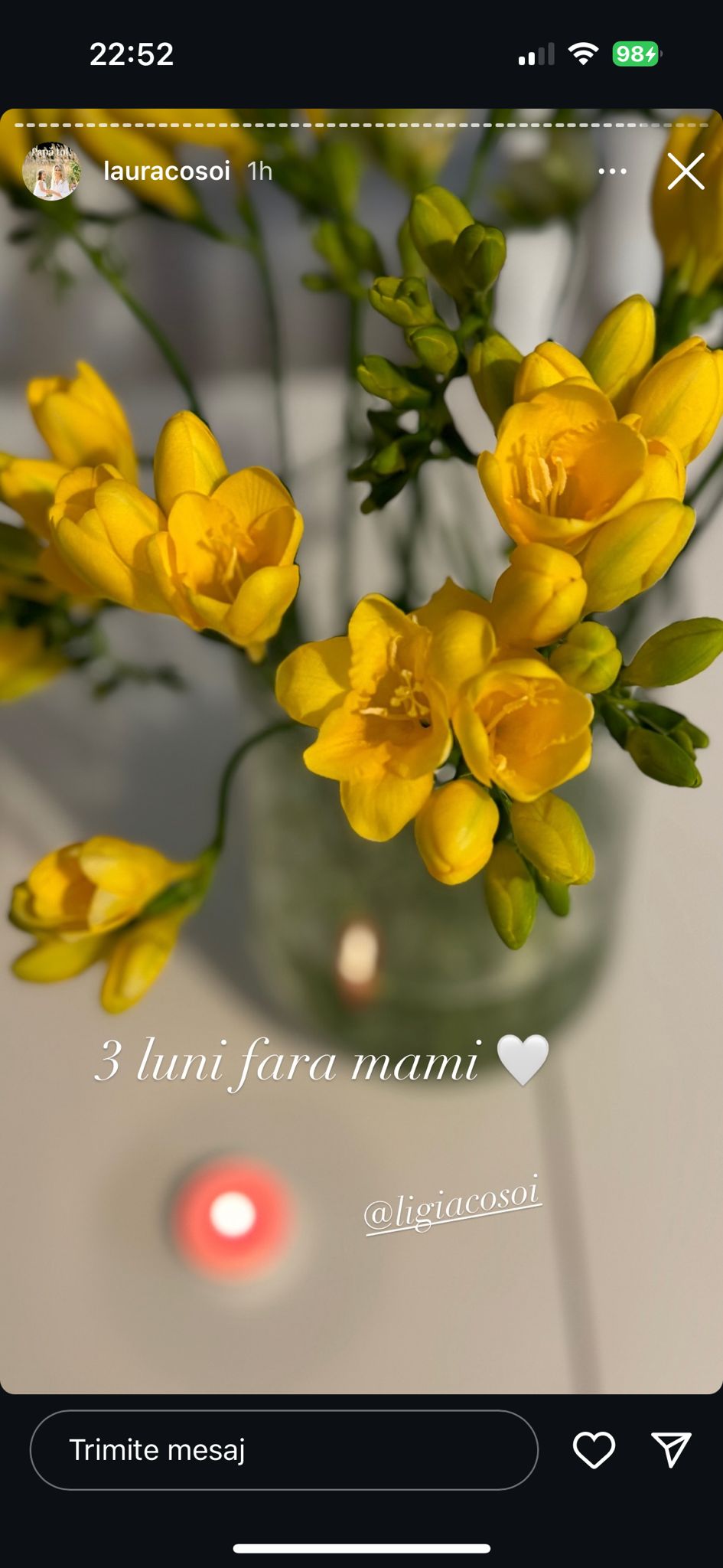 Blondina le-a dezvăluit fanilor din mediul online că simte prezența mamei sale în casă prin flori, lucru pe care l-a afirmat de nenumărate ori, iar astăzi s-a gândit mai mult ca niciodată la ea, dar și la lucrurile care s-au schimbat de când femeia nu mai este în viață. Laura Cosoi a povestit că îi duce dorul zi de zi mamei sale și nici acum nu s-a putut obișnui cu ideea că a murit.