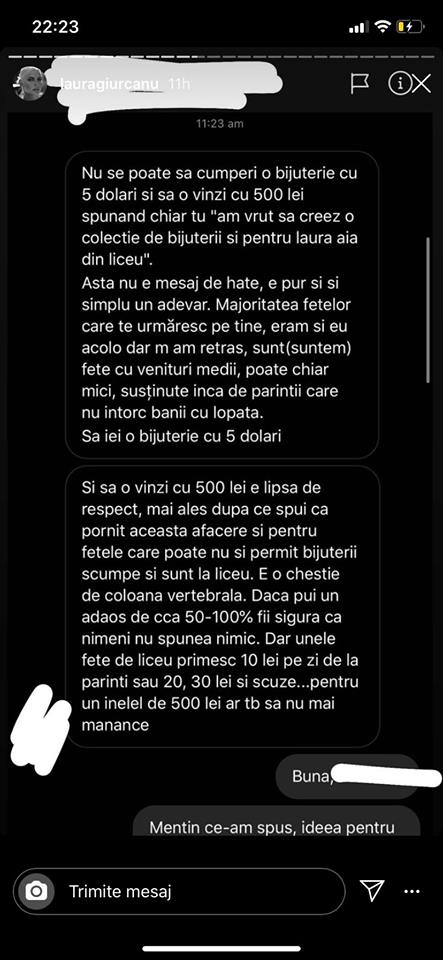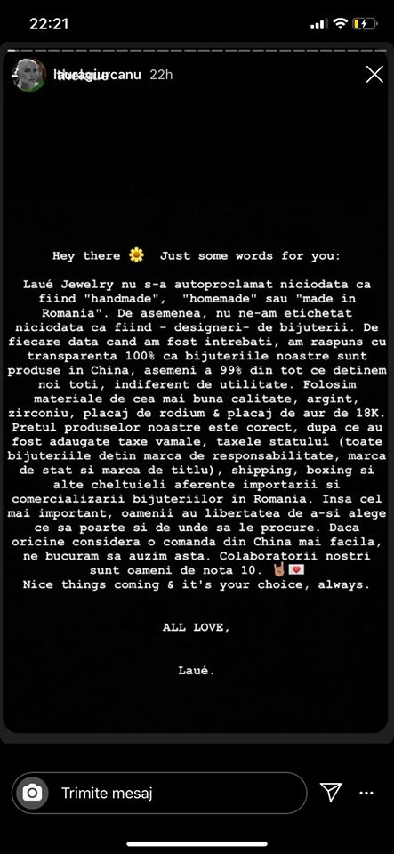 Astfel, Luara Giurcanu s-a văzut nevoită să le dea explicații oamenilor și le-a spus că ea niciodată nu a insinuat că bijuteriile sunt făcute de ea. Mai mult, influencerița a declarat că fiecare este liber să cumpere de unde îi place.