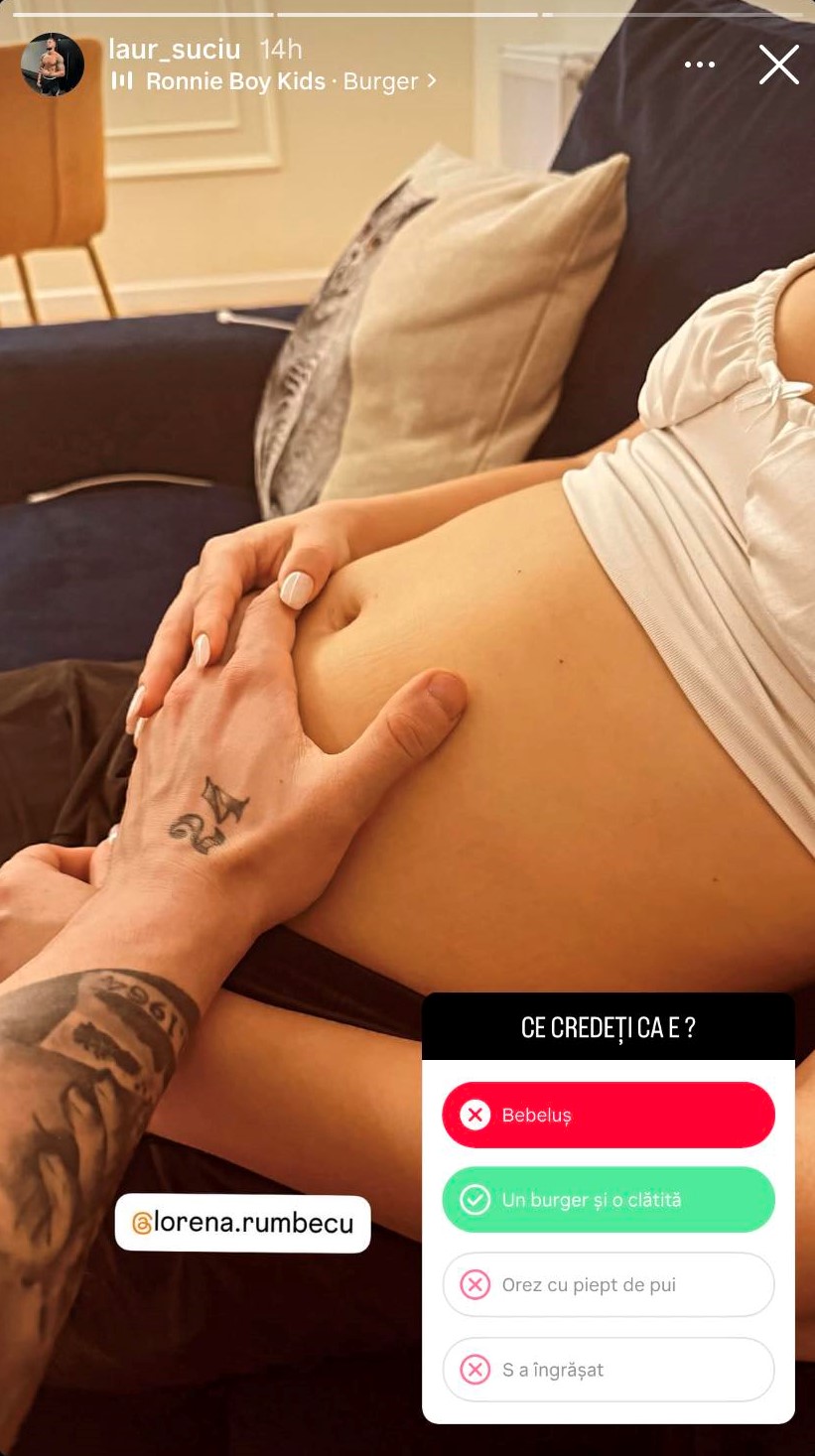 Ei bine, varianta corectă de răspuns nu era cea cu privire la bebeluș, așa cum toată lumea se aștepta, ci una dintre cele legate de mâncare. Mai precis, un burger și o clătită au făcut ca burtica Lorenei să semene cu cea a unei femei însărcinate, după cum a dezvăluit Laurențiu, în postarea de pe rețeaua de socializare.