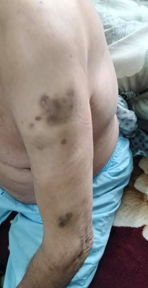 "Bunicul meu!! Atașez aceste poze să vedeți în ce țară trăim și în ce hal a fost externat după 10 zile de spitalizare în Brăila la spitalul județean. Săptămâna trecută am fost în vizită la bunicul meu care a fost luat cu ambulanța acum câteva zile deoarece a făcut un preinfarct, a venit salvarea. L-a dus la spital, internat. Evident că nimeni din familie nu a fost lăsat să între să-l viziteze, mâncarea este dusa bolnavilor ca la porci, paturi de tot rahatul, nu mai vorbim de mâncare și tratament.