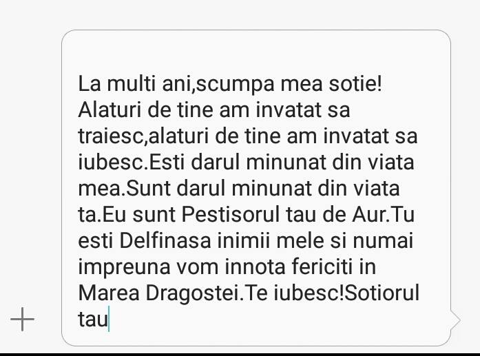 Probabil Laurentiu era de garda la spital si nu a putut sa-i spuna in fata “La multi ani!”, asa ca i-a trimis un mesaj, urmand ca atunci cand ajunge acasa sa o surprinda si cu un cadou si flori.