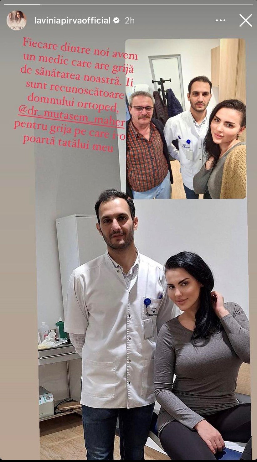 „Fiecare dintre noi avem un medic care are grijă de sănătatea noastră. Îi sunt recunoscătoare domnului ortoped pentru grija pe care i-o poartă tatălui meu”, a scris Lavinia Pirva, pe Instagram.