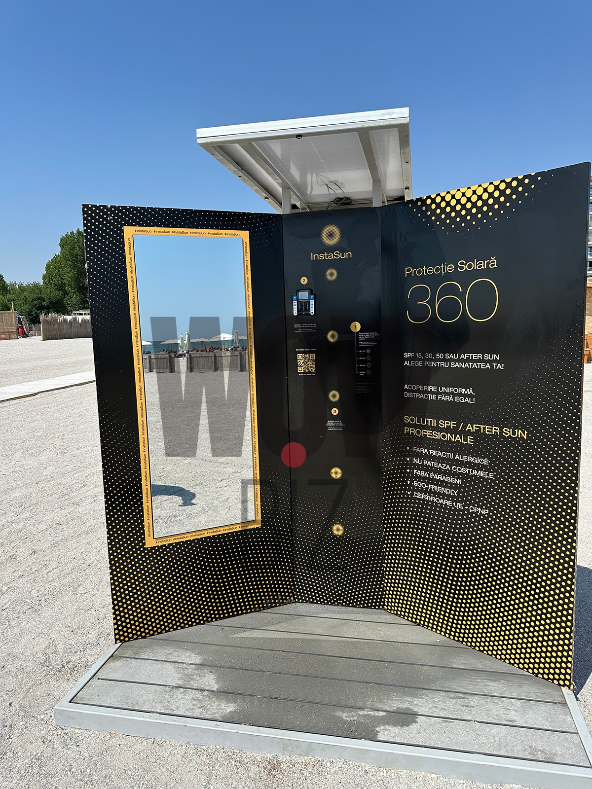 Pasul doi este plata. Aceasta se realizează doar cu cardul, direct în terminalul amplasat la tonomatul de pe plajă. După ce am selectat tipul de cremă și plătim suma necesară pentru loțiunea pe care am ales-o, trebuie să ne așezăm în dreptul orificiilor prin care ne va stropi cu loțiune și gata!