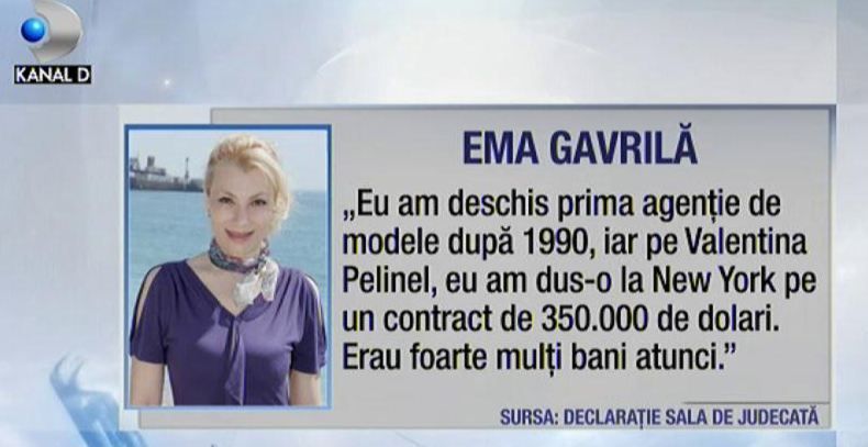 "Eu am deschis prima agentie de modele dupa 1990, iar pe Valentina Pelinel, eu am dus-o la New York pe un contract de 350.000 de dolari. Erau foarte multi bani atunci", a declarat Ema Gavrila pentru StirileKanalD.