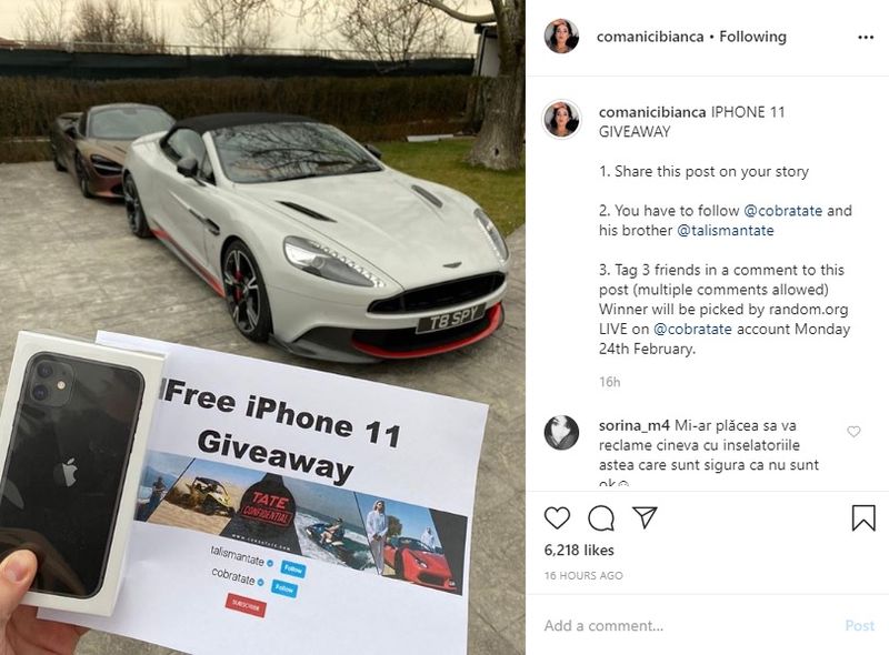 Aceștia i-au propus să facă un concurs de tip giveaway pe pagina ei de instagram urmărită deja de sute de mii de utilizatori. Astfel, internauții, aveau șansa să câștige un iphone11, dacă își lăsau numele în comentarii și dădeau follow conturilor de instagram ale fraților Tate.
