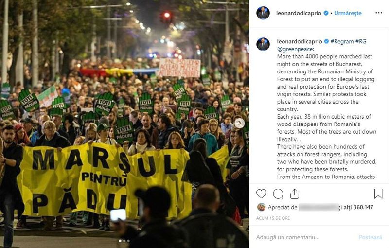 Leonardo DiCaprio a publicat pe pagina lui de Instagram o fotografie de la Marșul pentru Păduri, care a avut loc în București.