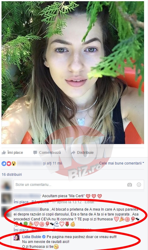 Ca niciodata, Buble a reactionat extrem de dur: “Pe pagina mea pastrez doar ce vreau eu!!! Nu am nevoie de rautati aici!”, e mesajul postat de artista.