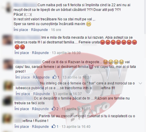 “I-ai destramat familia, vai de capu’ tau! Mai ai si tata preot”, “Nu inteleg de ce o femeie cu “har” care a avut norocul sa o iubeasca publicul pentru ce e… se transforma intr-o t***a ieftina!”, mai scriu altii.