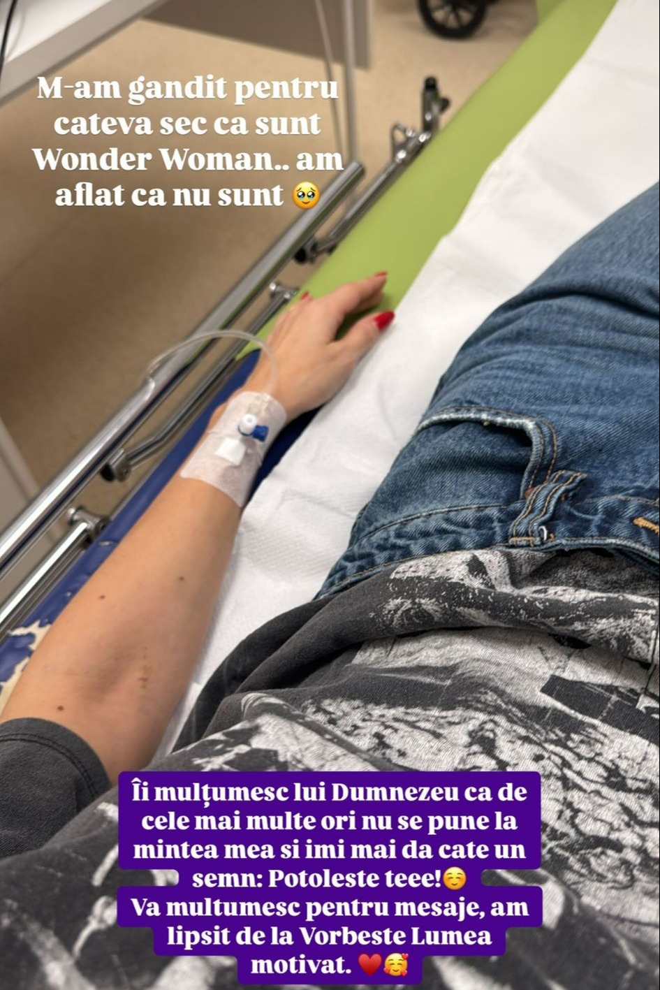 „M-am gândit pentru câteva secunde că sunt Wonder Woman... am aflat că nu sunt. Îi mulțumesc lui Dumnezeu că de cele mai multe ori nu se pune la mintea mea și îmi mai dă câte un semn: Potolește-te! Vă mulțumesc pentru mesaje, am lipsit de la (n.r.: emisiunea pe care o moderează) motivat”, a scris Lili Sandu, pe pagina personală de Instagram.