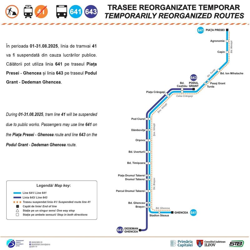 Societatea de Transport București anunță că linia de tramvai 41 se suspendă, începând cu data de 1 august 2025, ca urmare a necesității efectuării lucrărilor de infrastructură din intersecția Bulevardul Ghencea cu strada Constantin Titel Petrescu.