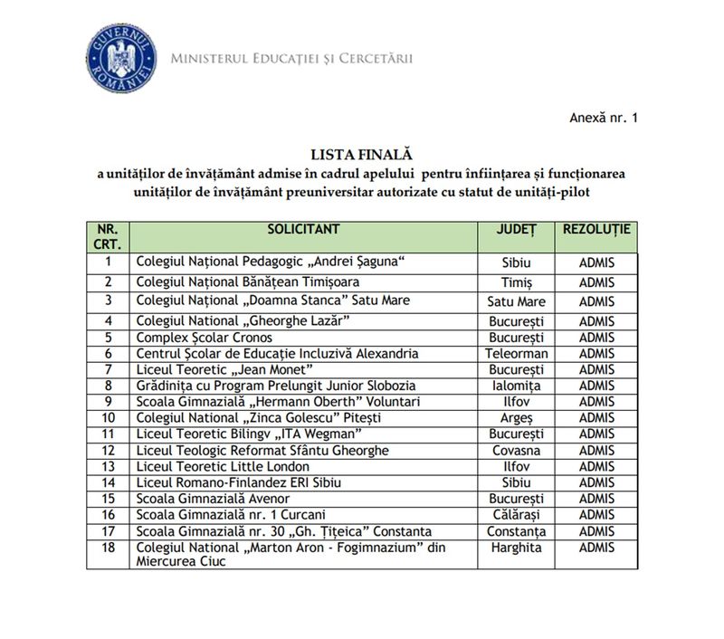 Lista finală publicată de minister include licee și școli din București, Sibiu, Timiș, Iași, Harghita, Constanța, Satu Mare, Ilfov, Ialomița, Teleorman, Covasna și Călărași. Toate au primit statutul de „unitate-pilot”.