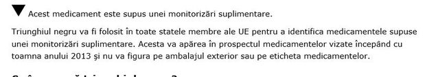 Medicamentul are pe prospect un triunghi de culoare neagra cu varful in jos, care semnifica faptul ca face obiectul unei monitorizari suplimentare.