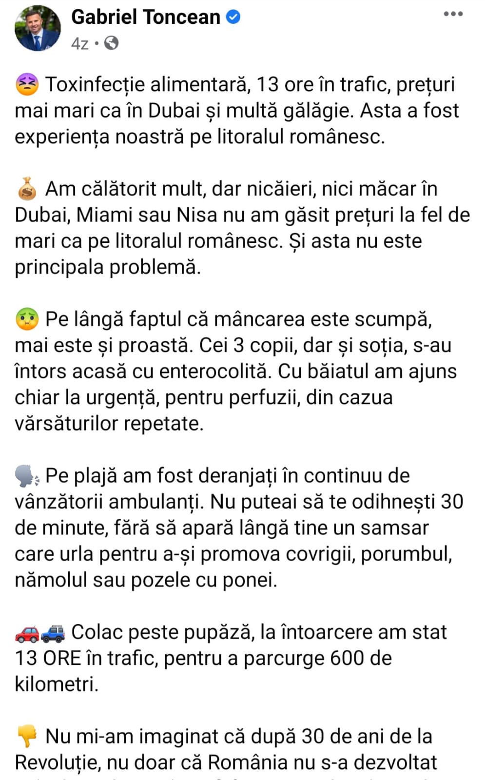 Gabriel Toncean a desființat litoralul românesc într-o postare pe rețelele de socializare, după ce familia i s-a îmbolnăvit în vacanță.