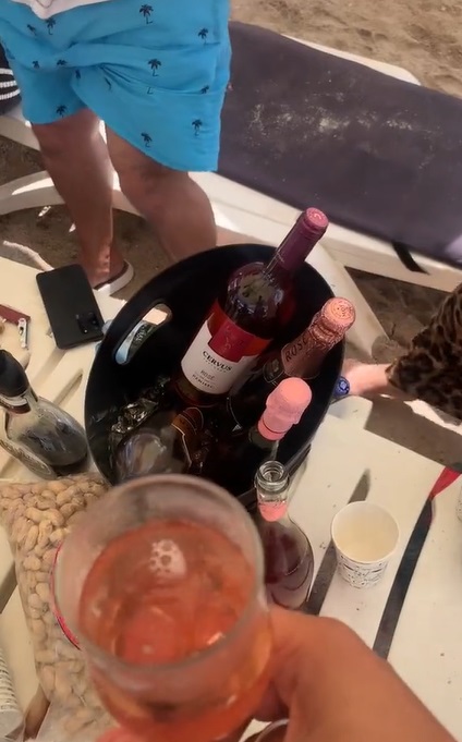 Însă aceasta nu a fost singura bunătate pe care turiștii au cărat-o până la malul mării. Oamenii au adus și costițe de porc. Iar ca totul să alunece bine pe gât, turiștii au adus pe nisip și câteva sticle de vin roze.