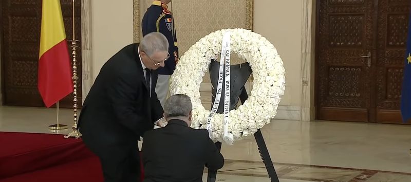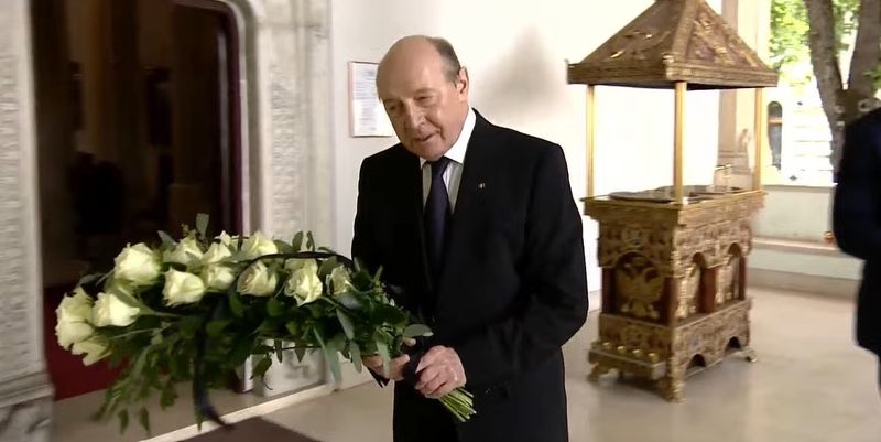 Și fostul președinte Traian Băsescu a ajuns, în urmă cu câteva momente, la Palatul Cotroceni. Lângă coroanele funerare trimise de ceilalți oameni politici, fostul șef de stat a așezat un buchet din trandafiri albi.