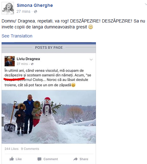 „Domnu’ Dragnea, repetati, va rog! DESZĂPEZIRE! DESZĂPEZIRE! Sa nu invete copiii de langa dumneavoastra gresit”, a scris Simona Gherghe pe pagina sa de Facebook.
