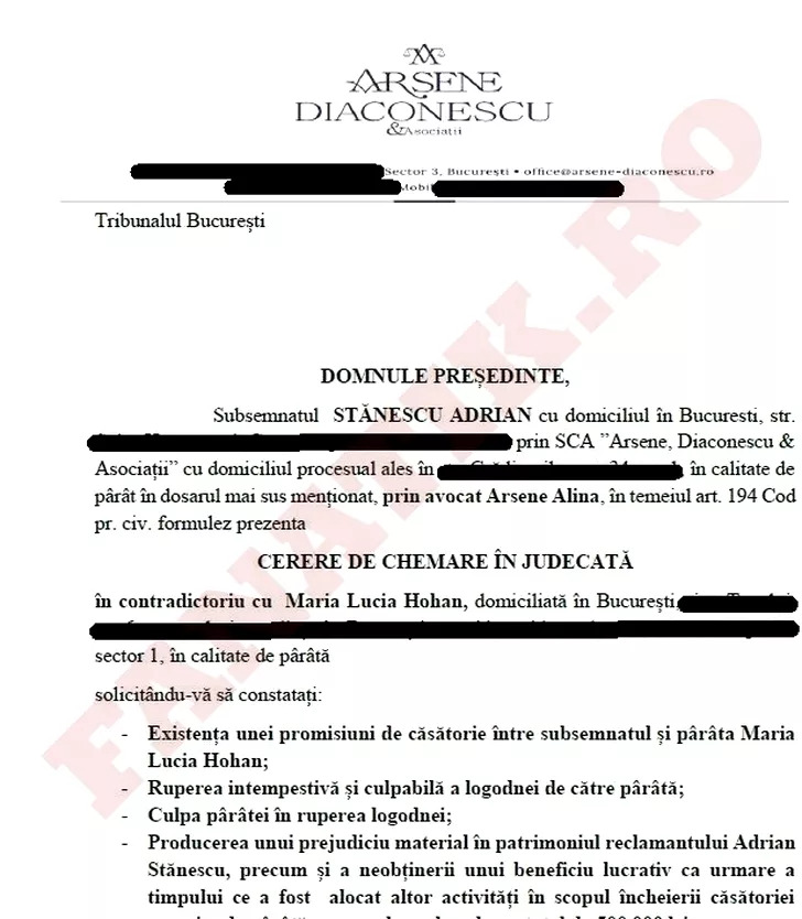 Adrian Stănescu și-a acuzat fosta logodnică nu numai de încălcarea promisiunii cu privire la căsătorie, ci și de infidelitate, în cei 11 ani pe care i-au petrecut împreună. Totuși, Lucia Maria Hohan nu a avut prea multe de spus referitor la procesul intentat de tatăl copiilor ei, fiind rezervată în privința subiectului: „Sincer, nu, nu vreau să comentez nimic! Dacă va fi cazul, veți primi un punct de vedere din partea uneia dintre cele 3 firme de avocatură care mă reprezintă.”, a declarat designerul, pentru Fanatik.ro.