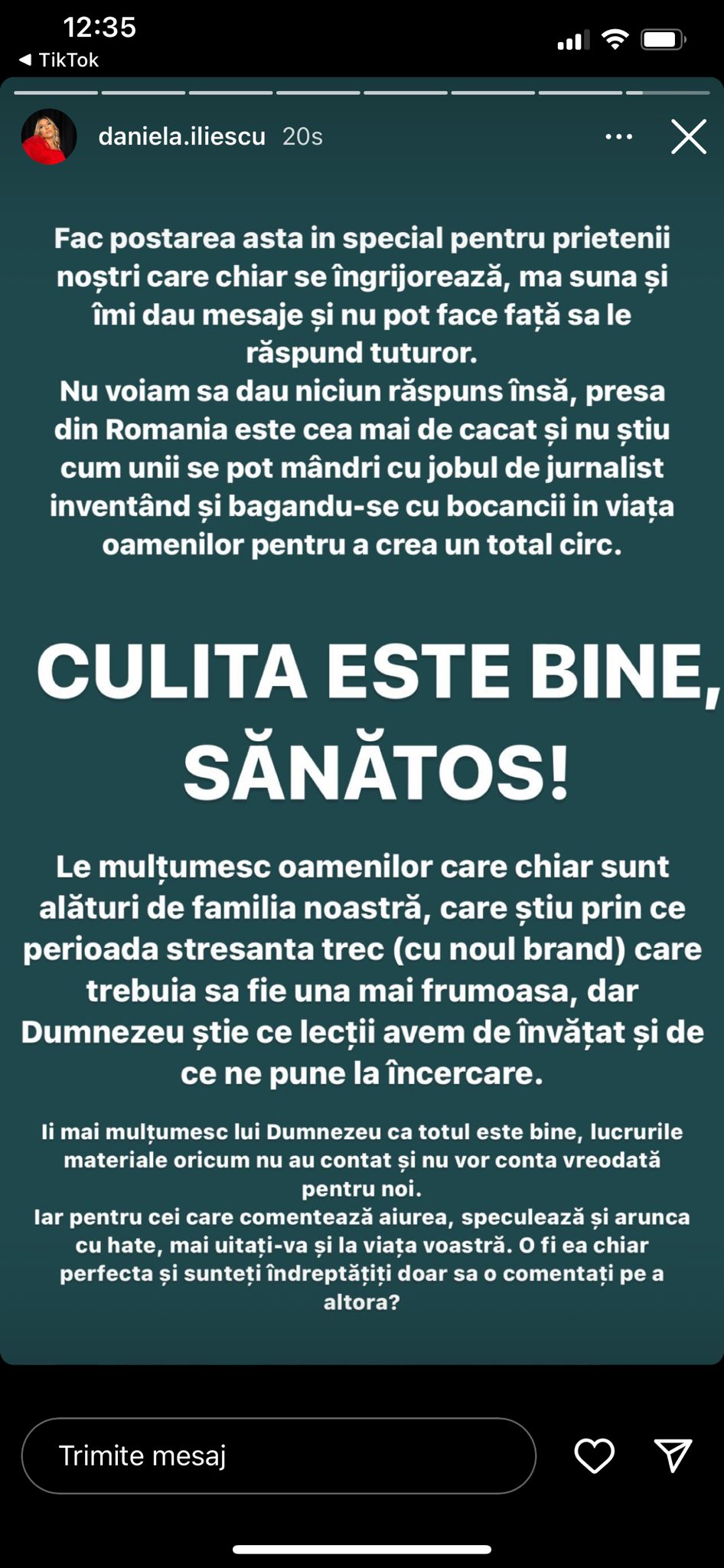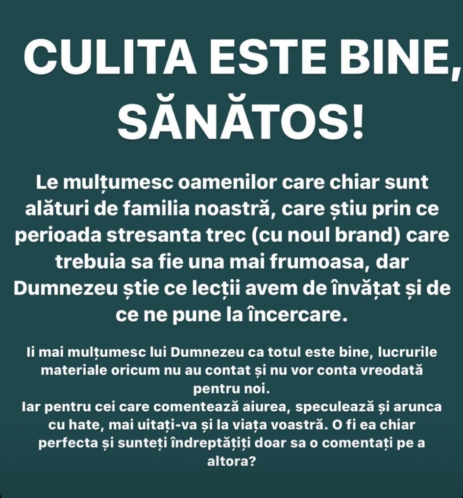 Cu numai câteva minute în urmă, partenera lui Culiță Sterp a scris în mediul online un mesaj prin care își asigură admiratorii de faptul că artistul se simte foarte bine din punct de vedere fizic și că, de asemenea, familia ei este din nou încercată de evenimente nefericite. Mama copilului lui Culiță a vrut să atragă atenția celor care comentează negativ și care aleg să arunce cu noroi spre logodnicul său în mod nejustificat, menționând ca mai întâi să arunce o privire la propria viață.
