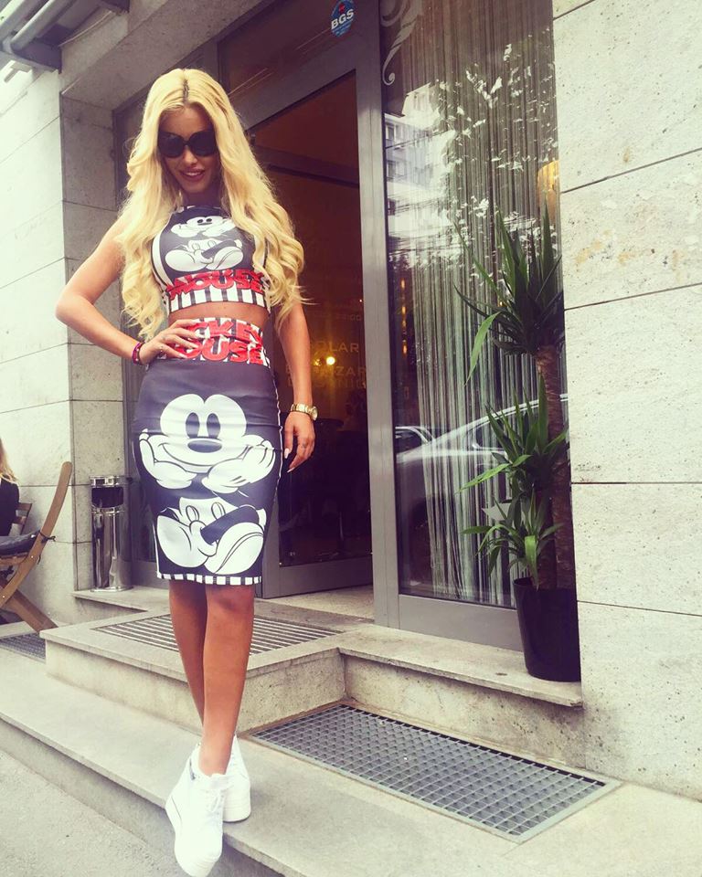 Copilaroasa din fire, blondina nu a ezitat sa poarte pe strada un maiou si o fusta perfect mulata pe formele apetisante pe care era desenata fata lui Mickey Mouse. Noi spunem ca arata bine, tu ce parere ai?