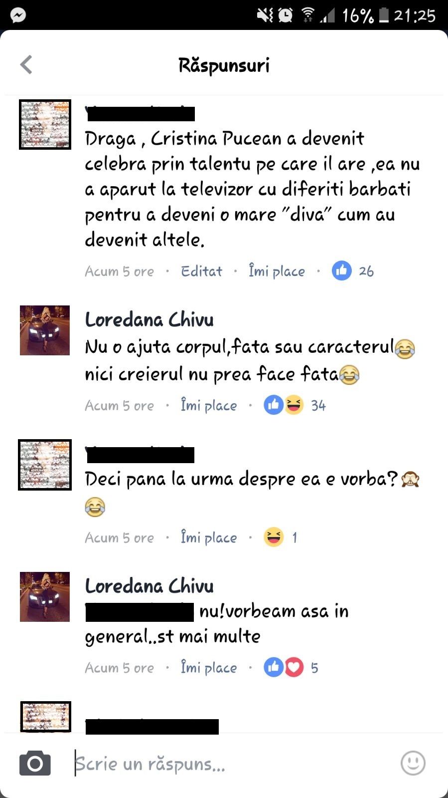 Cateva minute mai tarziu, o prietena virtuala a adus-o in discutie pe Cristina Pucean, o dansatoare de manele in mare voga, care a castigat de doua ori concursul Miss Piranda. Raspunsul Loredanei a fost extrem de dur: „Nu o ajuta corpul, fata sau caracterul.