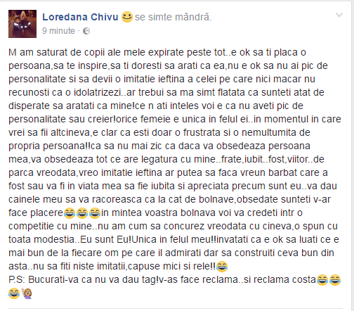nu sa fiti niste imitatii, capuse mici si rele! PS: Bucurati-va ca nu va dau tag! V-as face reclama si reclama costa!”, a scris Loredana Chivu. (E nervoasa din cauza sarcinii? Ce spune Loredana)
