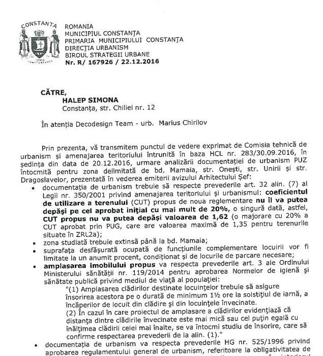 Pe 22 decembrie 2016, Comisia tehnica de urbanism a respins cererea Simonei Halep, sau mai precis – l-a retrimis arhitectilor care se ocupa de proiectul sportivei. In adresa primariei se arata ca „amplasarea cladirilor destinate locuintelor trebuie sa asigure insorirea acestira pe o durata de 1 ½ ore la solstitiul de iarna a incaperilor de locuit” si „in cazul in care proiectul de amplasare a cladirilor evidentiaza ca distanta dintre cladirile invecinate este mai mica sau cel putin egala cu inaltimea celei mai inalte, se va intocmi un studiu de insorire, care sa confirme prevederea de la alin 1″.