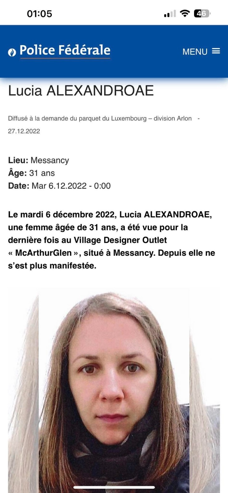 Autoritățile din România și din Belgia au început, la rândul lor, investigațiile privind dispariția femeii. «Dispărută din 9 decembrie de la domiciliul ei din Arlon (Belgia), unde locuia cu familia. Lucra la Eurostat-Soggeti în Luxemburg.» Dacă cineva a văzut-o sau are informații despre sora mea Lucia Alexandroae, vă rog să mă anunțe. Mulțumesc frumos!”, a fost mesajul transmis de una dintre surorile Luciei, pe rețelele de socializare.