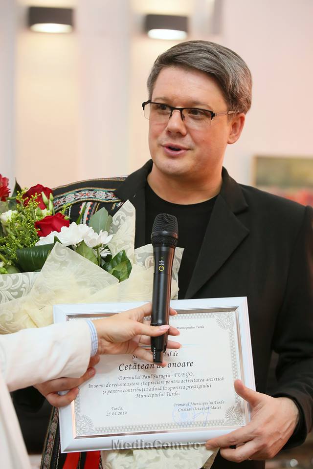 Grigore Vieru spunea, atunci când a primit titlul de cetățean de onoare al orașului Toplița, că distincția respectivă și titlul de membru al Academiei Române sunt pentru el mai mult decât un premiu Nobel. Eu am primit nenumărate distincții, onorante, valoroase, importante diplome și medalii, dar Nobelul meu, împlinirea și confirmarea identității mele, pentru satisfacția și sufletul meu vine abia acum. Voi reveni mereu, cu onoare și bucurie, cu muzica și arta mea, dăruind fericiri, în singurul loc în care prietenia, familia, părinții si apartenența, poartă și un nume, scris cu majuscule – TURDA! #paulsurugiufuego #cetățeandeonoareturda”, este mesajul postat de Fuego pe social media.