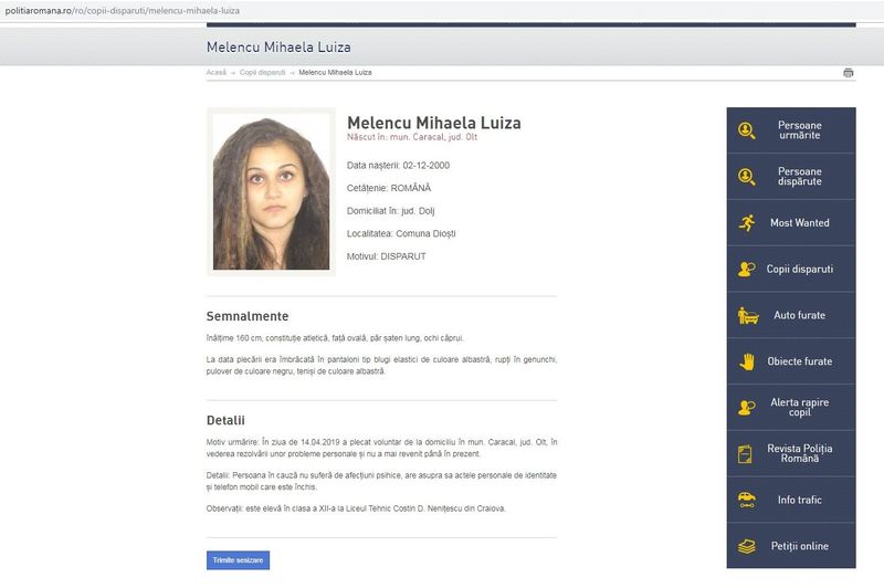 Luiza Melencu a figurat pe pagina ”Copii dispăruți” de pe site-ul Poliției Române până miercuri. Conform informațiilor, Luiza dispăruse din data de 14 aprilie 2019. Erau prezentate semnalmentele și cu ce era îmbrăcsată la data dispariției. Mai jos o captură cu pagina pe care apărea Luiza.