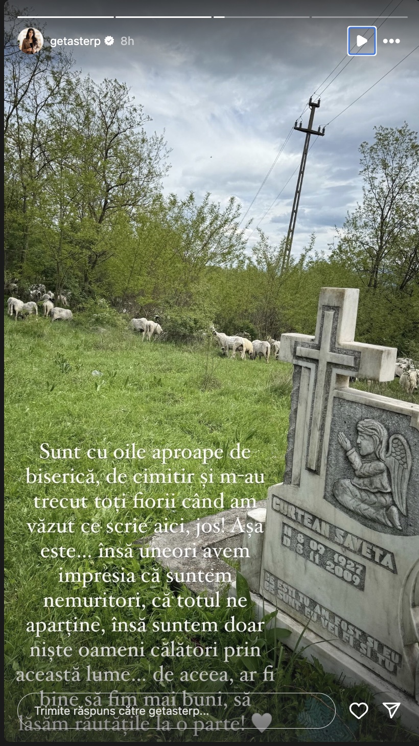 „Sunt cu oile aproape de biserică, de cimitir și m-au trecut fiorii când am văzut ce scrie aici jos! Așa este… însă uneori avem impresia că suntem nemuritori, că totul ne aparține, însă suntem doar niște oameni călători prin această lume… de aceea ar fi bine să fim mai buni, să lăsăm răutățile la o parte!”, a scris geta Sterp în mediul online.