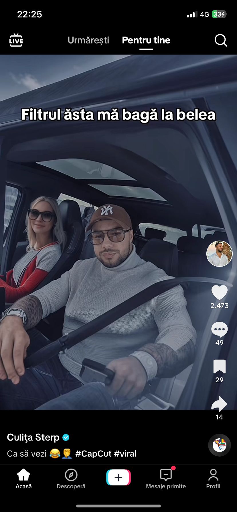 Culiță Sterp a „riscat” și a postat în mediul online imaginea în care filtrul pe care l-a folosit i-a generat o imagine în care apare pare că se află în mașină alături de o altă femeie. În secțiunea de comentarii, amuzată la rândul ei de situație, logodnica sa a reacționat imediat.