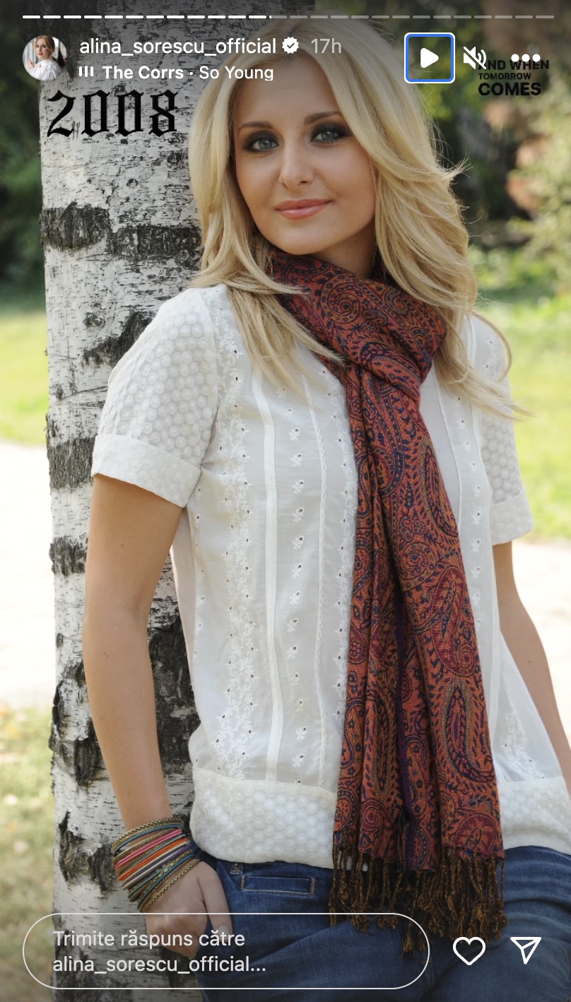 „Și poza cu mine de când aveam 22 de ani, deci de acum 15 ani... Zic că nu e așa o mae diferență. Cu un pic mai multă experiență de viață, ce-i drept... Dar în rest zic că mă țin binișor”, a scris Alina Sorescu în mediul online.