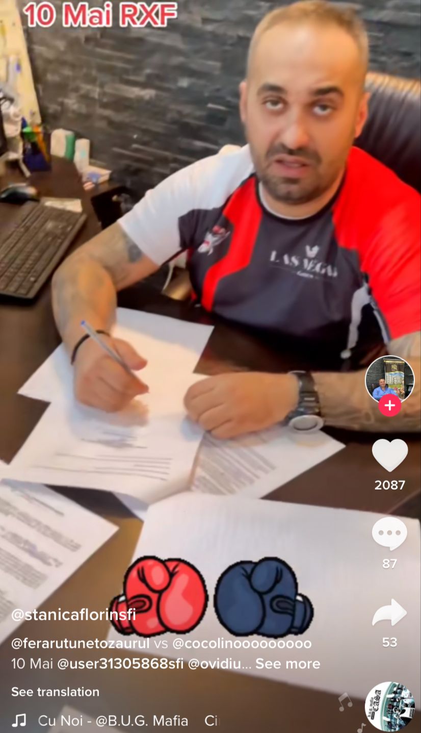 Mădălin Feraru intră în ”cușcă”, unde se va bate cu Cocolino, o altă celebritate a TikTok-ului! Denumit și ”Tunetozaurul” TikTok-ului, Feraru pare că nu este deloc speriat de meciul ce urmează împotriva lui Cocolino, pe 10 mai. Acesta a semnat deja contractul respectiv, anunțul fiind făcut pe toate rețelele de socializare. Meciul dintre Mădălin Feraru și Cocolino va fi în aceeași zi cu meciul dintre Iancu Sterp și Ovidiu Neveu.